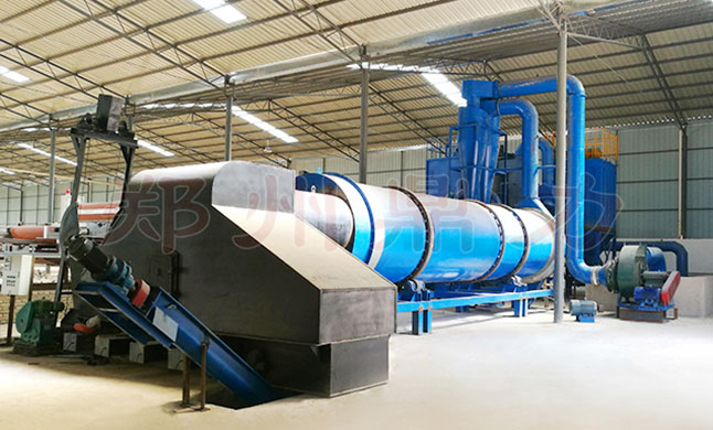 Air Flow: The air through hot blast stove fan inflating, the air enters into the hot blast stove for combustion heating. Its temperature reaches up to 600-850℃, then it is inhaled by the dryer induced draft fan absorted to dry material and evaporate water. Through the heat exchange drying the material. When temperature decreases to 55-85℃, it is discharged out of the dryer. Wet dust are discharged on standard through the cyclone and the pulse dust collector purifying and emission.