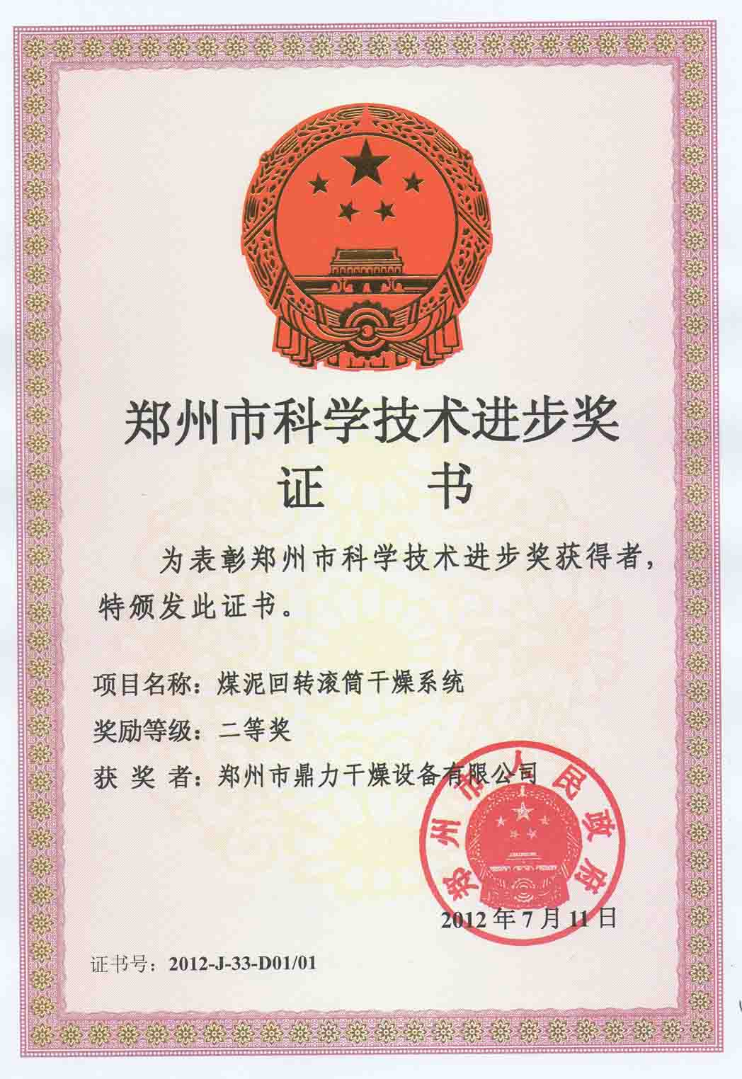 我公司煤泥回轉滾筒干燥系統(tǒng)項目被鄭州市科學技術局授予2012年度科技進步獎項二等獎獲獎榮譽證書。(圖)